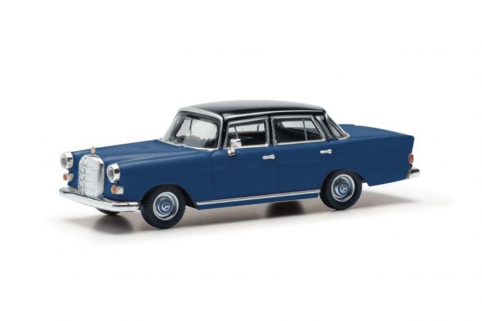 Die legendäre Heckflosse von Mercedes-Benz erscheint nun in blau mit schwarz abgesetzem Dach. Das Modell auf Basis der 1965er Version ist mit vielen Details bedruckt. Der Mercedes-Stern an der Front ist als feines Fotoätzteil separat eingesetzt.