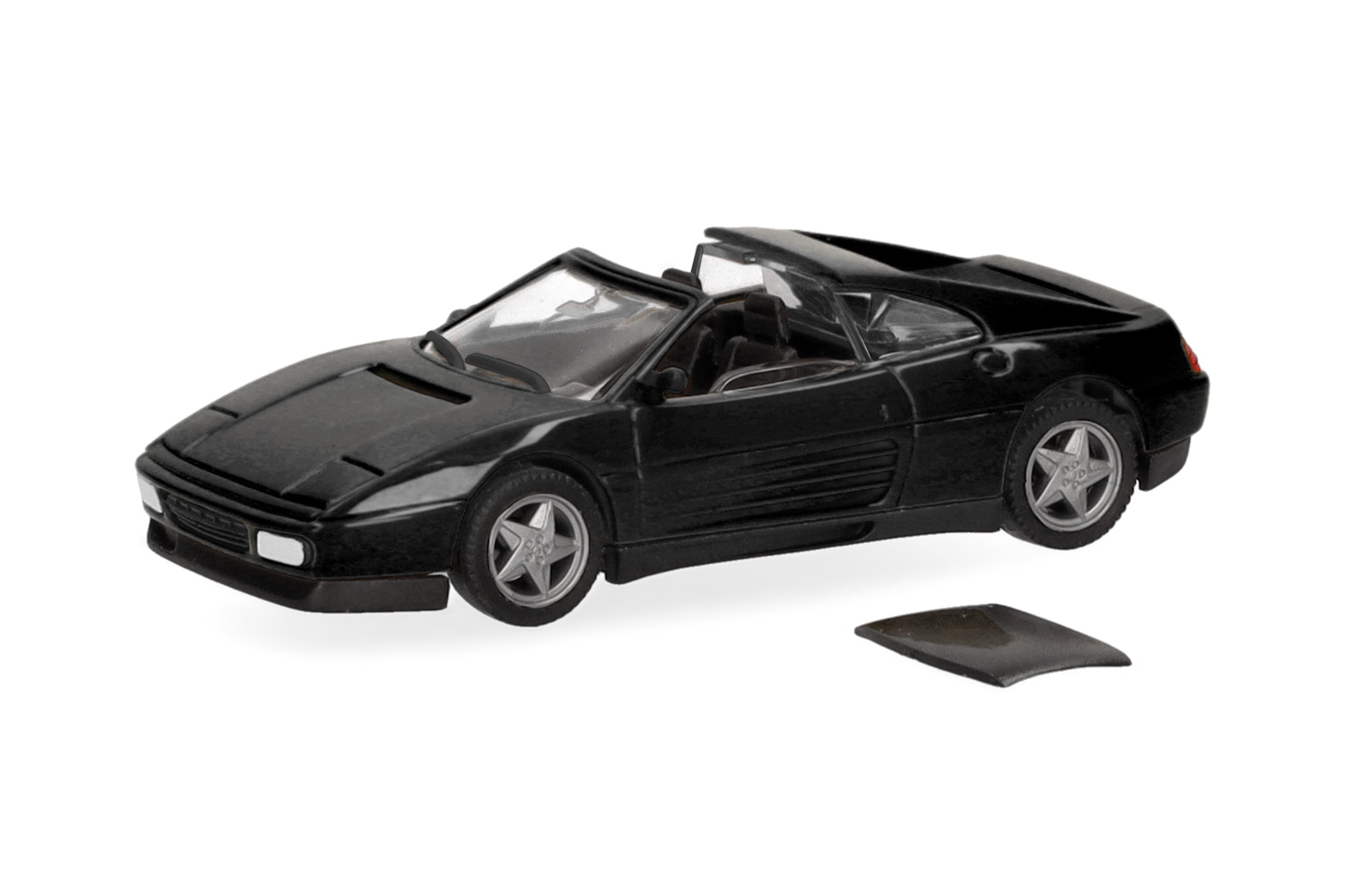 Auch die Variante mit zu öffnendem Dacheinsatz, als Ferrari 348 ts benannt, hat mittlerweile den Status eines Klassikers erreicht und kommt in der Farbgebung nero bei Herpa zu neuen Ehren.