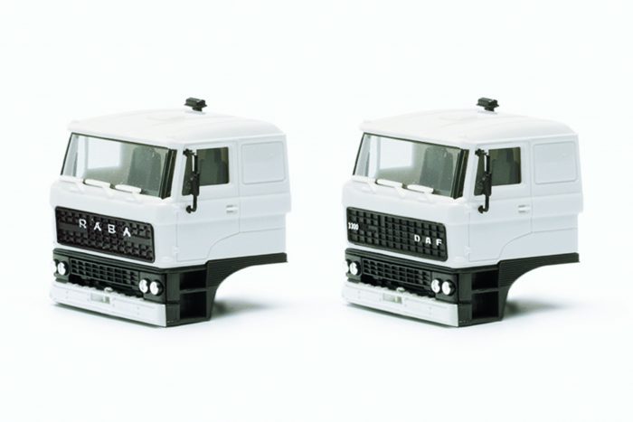 Der DAF 2800-3300 ist ein Klassiker und der Rába eine positive Nebenerscheinung. Mit diesem Set ist es möglich, zwei komplette Fahrerhäuser des DAF 2800-3300 (lange Kabine) zusammenzubauen. Wahlweise kann dann entweder der Kühlergrill DAF oder der Rába eingesetzt werden, da beide zweifach beiliegen. Passende Fahrgestelle sind 085816 (2achs Zugmaschine) oder 085823 (3achs Zugmaschine).
