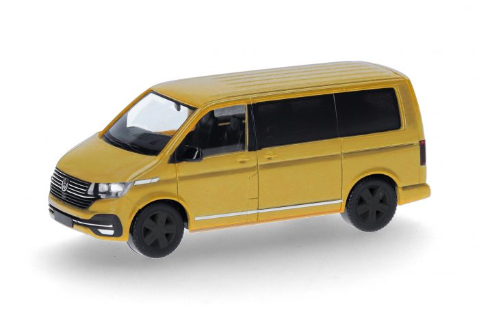 Der VW T 6.1 Caravelle hat keinen Lieferwagen-Status, eher zählt er zu den beliebtesten Familien-Vans europaweit. In der Farbgebung Grape Yellow erscheint das Modell bei Herpa als Farbneuheit.