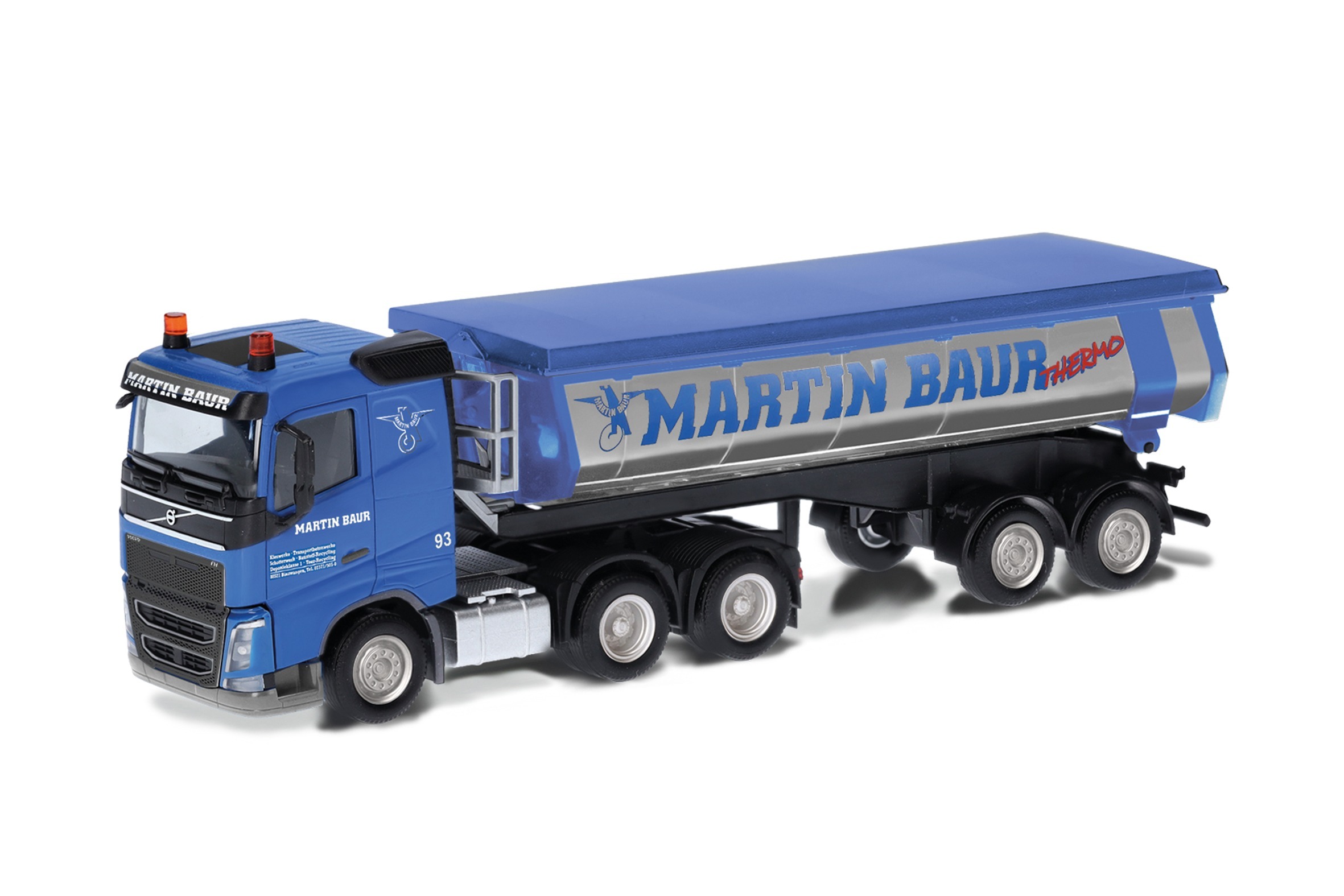 Neben dem Schwerlastgeschäft ist Martin Baur auch in weiteren Transportsektoren unterwegs. Nach der Formneuheit des luftgefederten MAN-Sattelzuges Mitte 2023 (316156) erscheint nun mit diesem Volvo Kipp-Sattelzug ein zweites Modell des Unternehmen Martin Baur aus Ertingen-Binzwangen. Der 3achsige Volvo FH mit Flachdach hat einen 2achsigen Thermomuldeauflieger gesattelt und erscheint in limitierter Auflage.