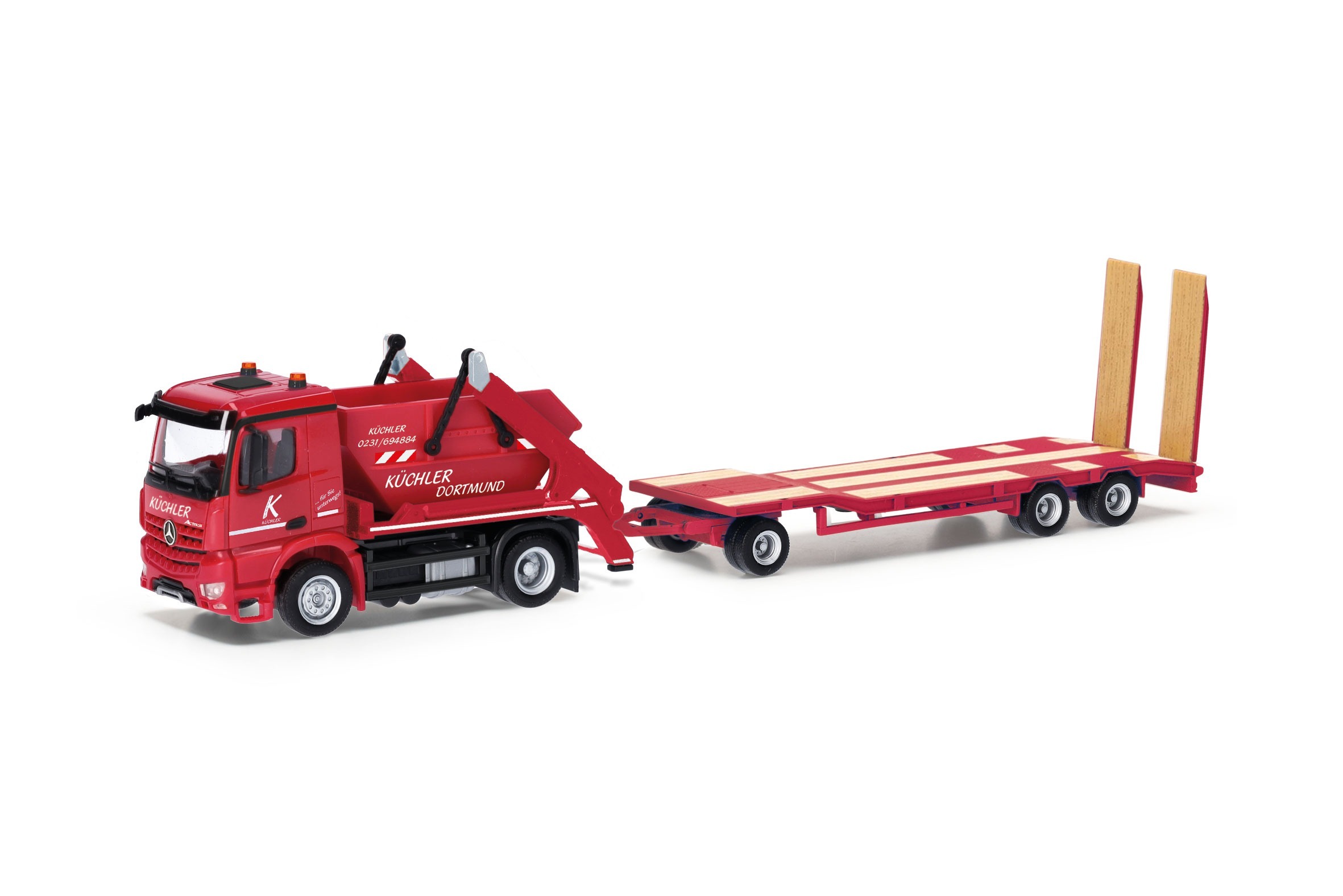 In Dortmund ist das Unternehmen Küchler ansässig, von dem Herpa ein erstes Miniaturmodell realisiert. Der Mercedes-Benz Arocs M Meiller Absetzkipper AK12 ist mit einer 7m³ Mulde bestückt und zieht einen Goldhofer TU3 Anhänger.