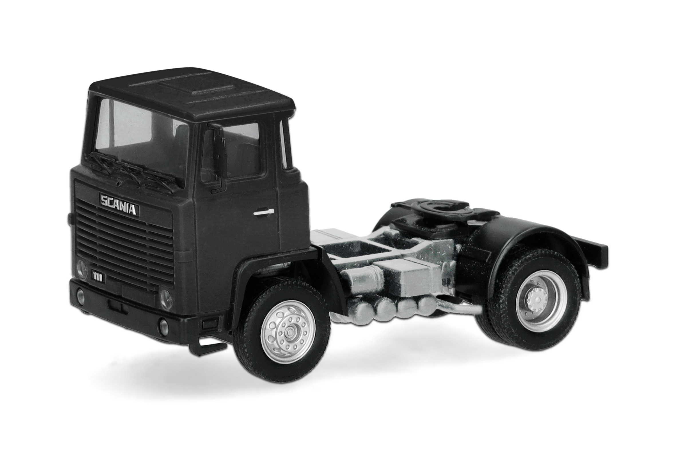 Die klassische Scania 111 Zugmaschine mit Nahverkehrs-Fahrerhaus erscheint in neuer Farbgebung schwarz.