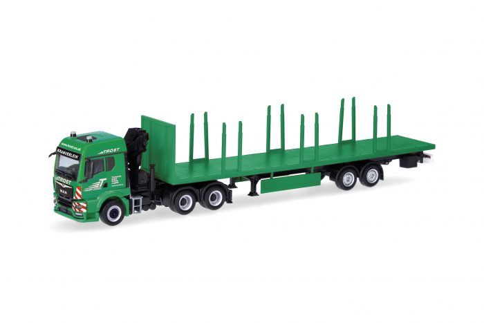 Auch das in Traisen in Österreich ansässige Unternehmen Trost stellt erneut das Vorbild für ein außergewöhnliches Herpa-Modell. Die aktuelle dreiachsige MAN Zugmaschine ist mit einem Ladekran ausgestattet und zieht einen zweiachsigen Flachbettauflieger mit Rungen, auf dem beim Original vornehmlich Röhren verladen werden.