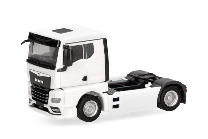 Formneuheit ! Die Palette der Fahrerhausvarianten von MAN wird um diese TGX GN genannte Kabine mit flachem Dach ergänzt. Die zweiachsige Zugmaschine erscheint mit weißem Fahrerhaus.